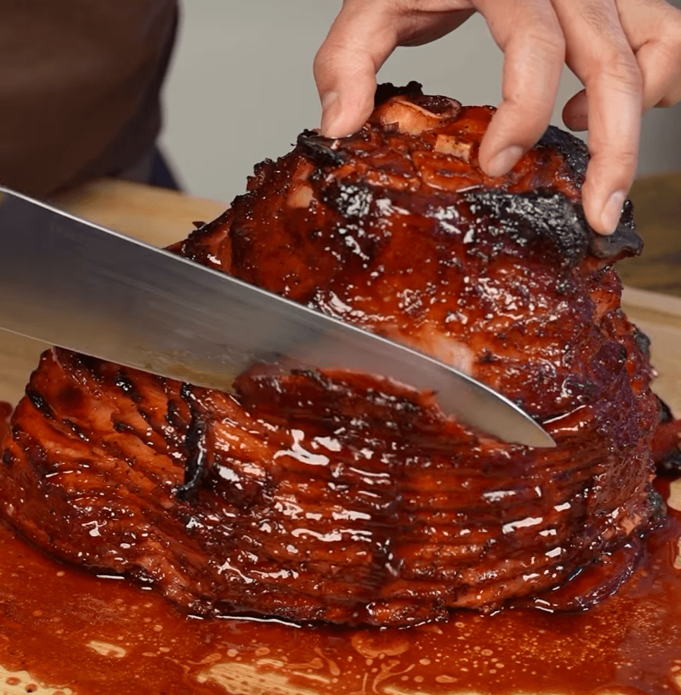 - Take the excess marinade and reduce until thick and syrupy and coat the ham with it.