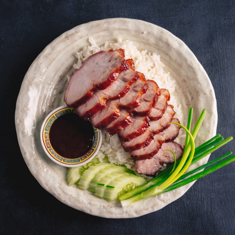 7. Remove the pork from the oven. Baste both sides of the pork with the thickened marinade. Place back into the oven to cook for another 20 minutes or until cooked through. Remove from the oven, add another layer of basting sauce and rest for 10 minutes before slicing.
