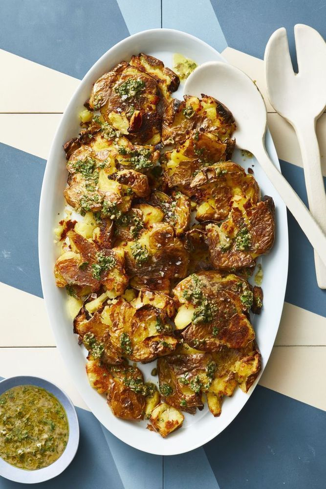 2. Meanwhile, arrange oven racks so one is 6 inches from broiler and heat oven to 450°F. Oil large rimmed baking sheet. Place each potato on sheet and, with bottom of glass, gently press until crushed but still intact. Brush tops with 1 tablespoon oil and roast 25 minutes.
