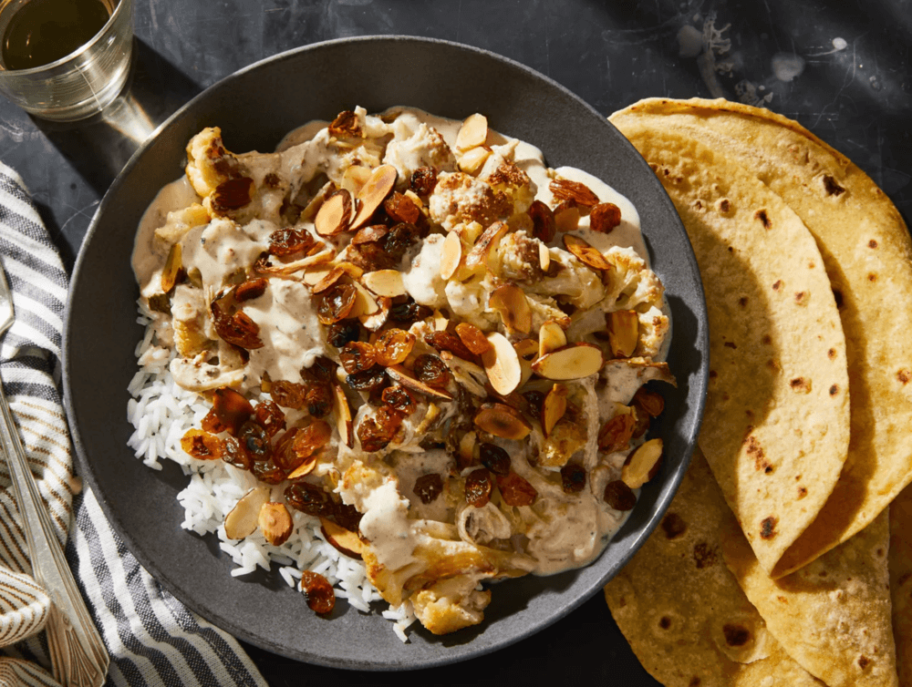 6. To serve, scatter the raisins and toasted almonds over the top of the cauliflower, and serve with rice or chapatis.