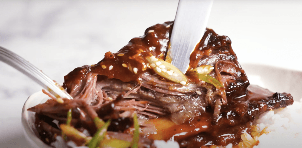 - Slow cook for 12 hours until the meat can be shredded apart. Take the meat out of the sauce, increase the heat of the sauce and adjust the taste with water/soy sauce or more acidity. Once you’re happy with the sauce, add a cornstarch slurry of 2 Tbsp of cornstarch and cold water mixed in. Let it simmer or boil until the sauce thickens.